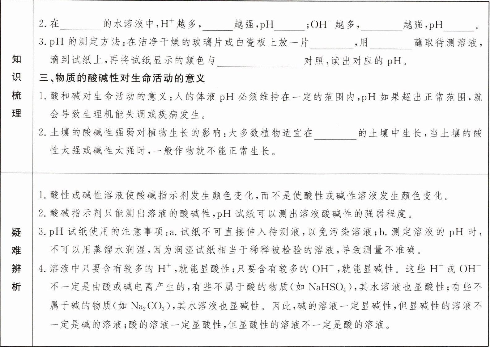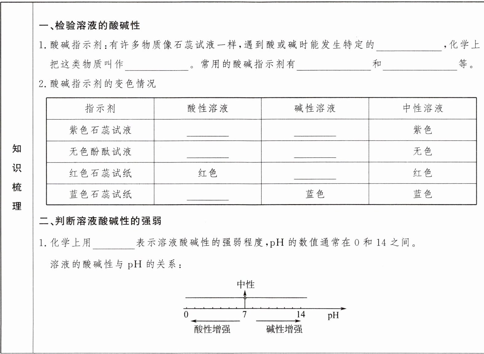 一、1.颜色变化 酸碱指示剂 紫色石蕊试液 无色酚酞试液 2.红色 蓝色 无色 红色 蓝色 红色 二、1.pH 2.一定量 酸性 越小 碱性 越大 3.pH试纸 玻璃棒 pH标准比色卡 三、2.接近中性