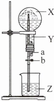 7. 如图所示,烧瓶内盛有X气体,挤压滴管的胶头a,使液体Y进入烧瓶中,振荡烧瓶并倒放在铁架台上;将导管伸入滴有Z的水中,打开弹簧夹b,可见烧杯中的液体如喷泉一样喷入烧瓶中,并出现颜色的改变。X、Y、Z可能是( )