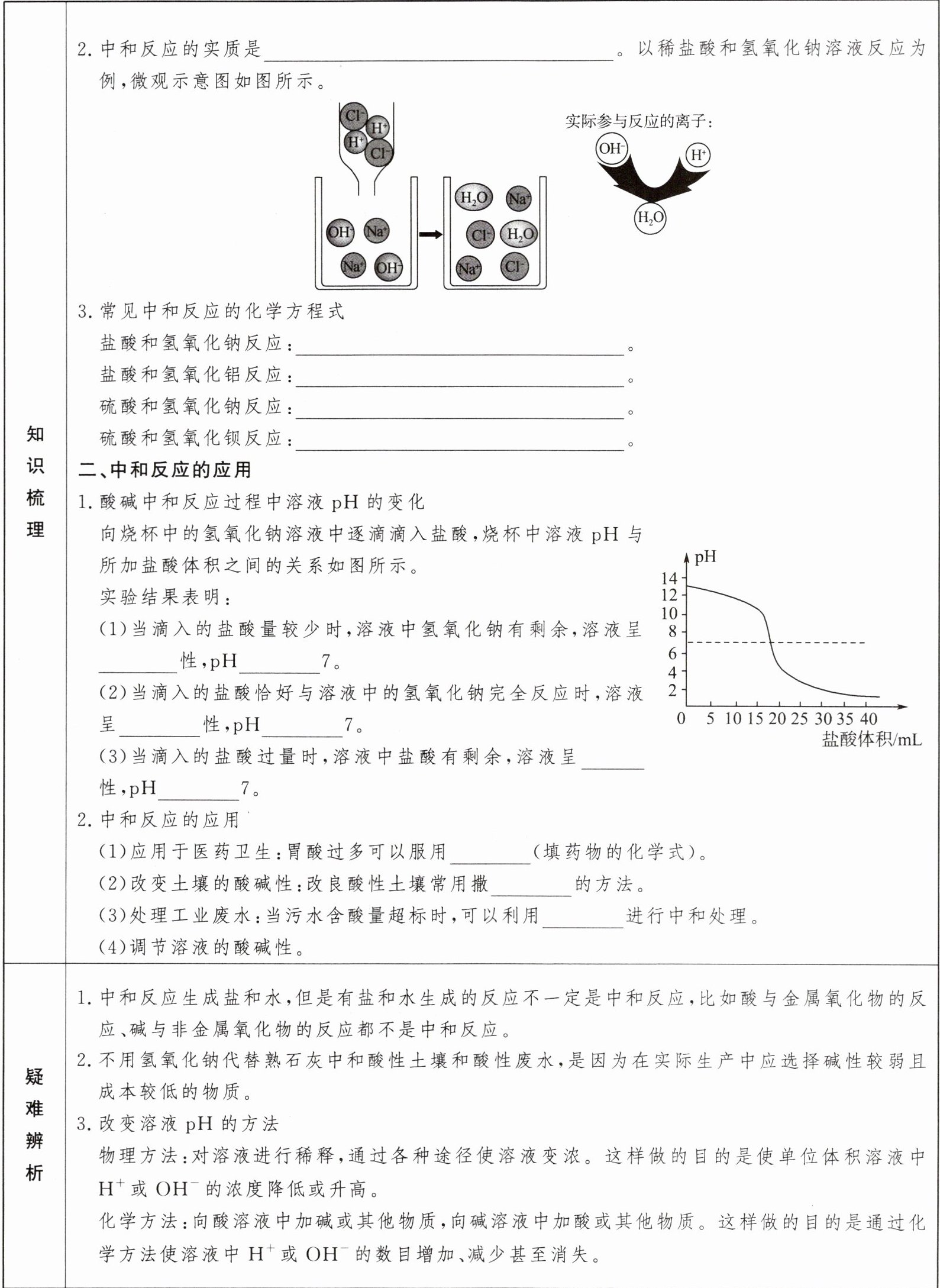 一、1.酸与碱 盐和水 放出 2.H⁺和OH⁻结合生成H₂O 3.HCl+NaOH=NaCl+H₂O 3HCl+Al(OH)₃=AlCl₃+3H₂O H₂SO₄+2NaOH=Na₂SO₄+2H₂O H₂SO₄+Ba(OH)₂=BaSO₄↓+2H₂O 二、1.