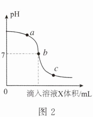 2. 为验证 $ {NaOH} $ 溶液和稀盐酸能够发生反应,兴趣小组用如图 1 所示装置进行实验,烧杯内溶液的 pH 随滴入溶液 X 体积变化的曲线如图 2 所示。下列说法错误的是(