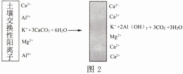 。(4)用适量的石灰石粉末(CaCO₃)改良上述土壤的原理如图 2 所示,说明石灰石中的 Ca²⁺把土壤颗粒上吸附的