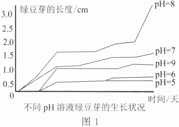 (填“1”“2”或“3”)。(2)模拟不同酸碱度土壤对植物生长的影响:项目小组分别在 5 个烧杯中倒入不同 pH 的溶液 50 mL,保持其他条件一致,放入 8 粒大小一样的绿豆,观察记录,数据如图所示。由图 1 可知,土壤 pH=