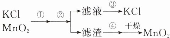 4. 下图是小勇设计的分离${KCl}$和${MnO_{2}}$固体混合物的流程图,图中的数字序号所对应的操作步骤错误的是(