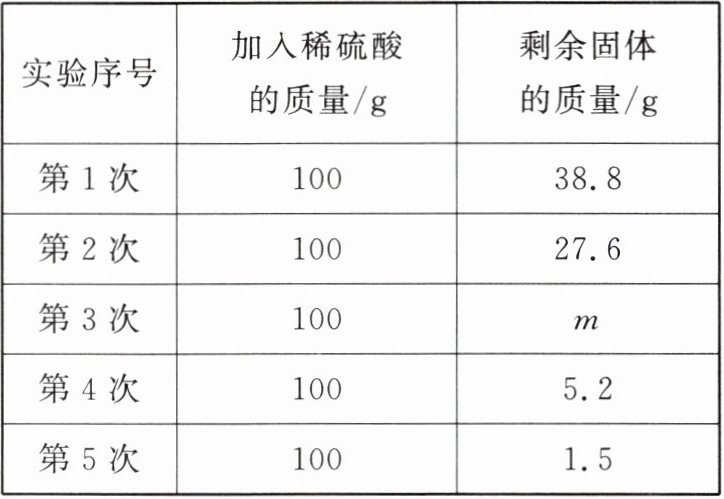 由表中数据可知,每次加入$100g$稀硫酸,固体减少的质量为$50g - 38.8g=11.2g$,第二次加入$100g$稀硫酸后,固体又减少$38.8g - 27.6g = 11.2g$,所以第三次加入$100g$稀硫酸时,固体也减少$11.2g$,则$m=27.6g−11.2g = 16.4g$。