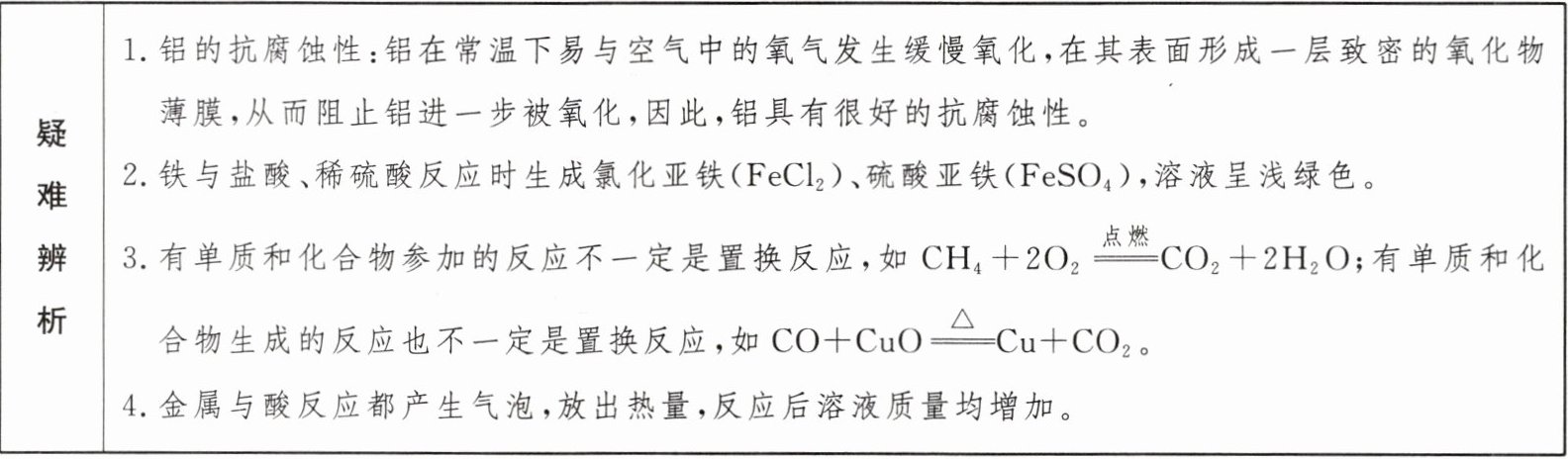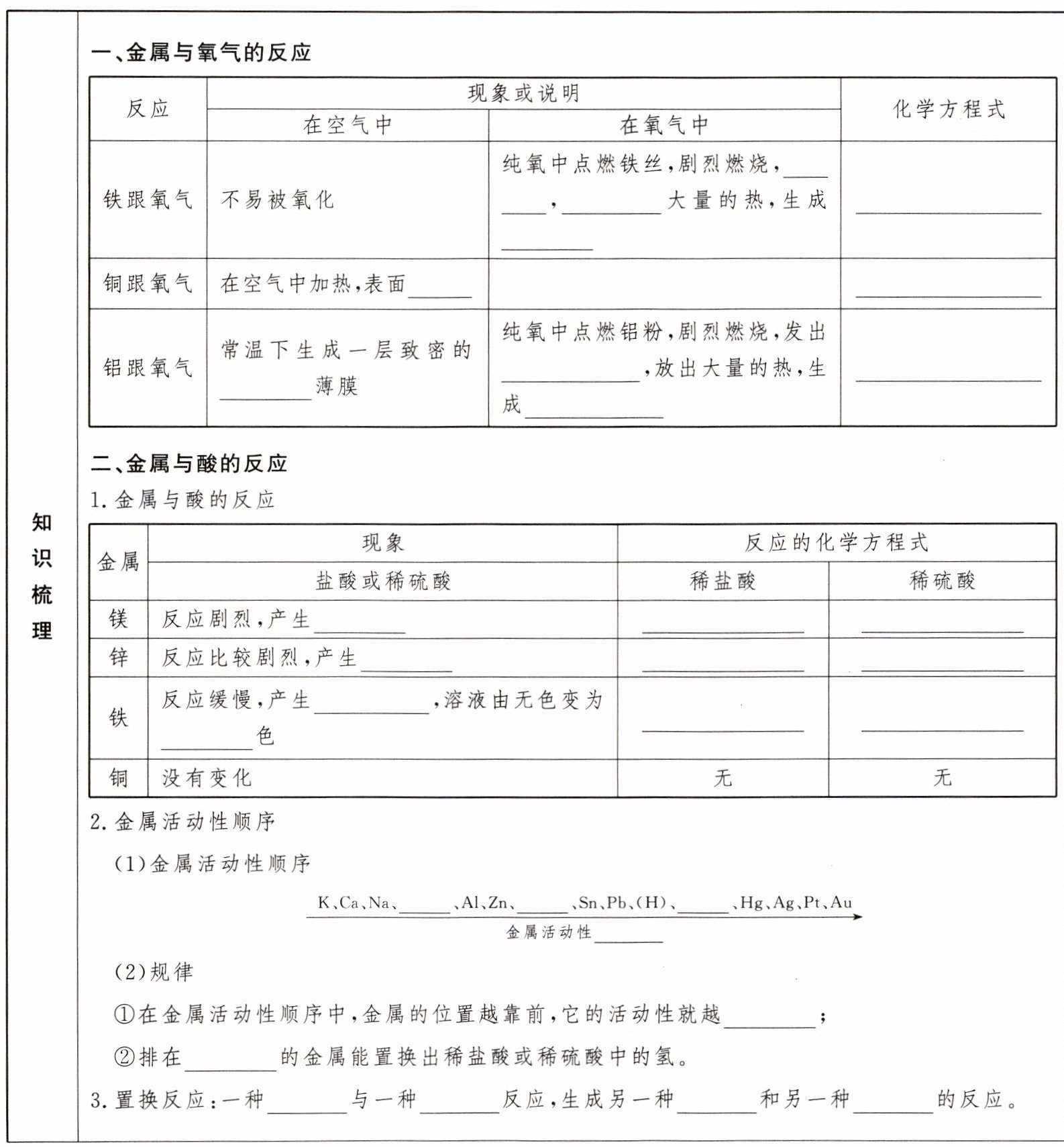 一、火星四射 放出 黑色固体 $3\mathrm{F}\mathrm{e}+2{\mathrm{O}}_{2}\xlongequal{\text{点燃}}\mathrm{F}{\mathrm{e}}_{3}{\mathrm{O}}_{4}$ 变黑 $2\mathrm{C}\mathrm{u}+{\mathrm{O}}_{2}\xlongequal{\triangle}2\mathrm{C}\mathrm{u}\mathrm{O}$ 氧化铝 白光 白色固体 $4\mathrm{A}\mathrm{l}+3{\mathrm{O}}_{2}\xlongequal{\text{点燃}}2\mathrm{A}{\mathrm{l}}_{2}{\mathrm{O}}_{3}$ 二、1. 大量气泡 $\mathrm{M}\mathrm{g}+2\mathrm{H}\mathrm{C}\mathrm{l}\xlongequal{\;\;}\mathrm{M}\mathrm{g}\mathrm{C}{\mathrm{l}}_{2}+{\mathrm{H}}_{2}\uparrow$ $\mathrm{M}\mathrm{g}+{\mathrm{H}}_{2}\mathrm{S}{\mathrm{O}}_{4}\xlongequal{\;\;}\mathrm{M}\mathrm{g}\mathrm{S}{\mathrm{O}}_{4}+{\mathrm{H}}_{2}\uparrow$ 较多气泡 $\mathrm{Z}\mathrm{n}+2\mathrm{H}\mathrm{C}\mathrm{l}\xlongequal{\;\;}\mathrm{Z}\mathrm{n}\mathrm{C}{\mathrm{l}}_{2}+{\mathrm{H}}_{2}\uparrow$ $\mathrm{Z}\mathrm{n}+{\mathrm{H}}_{2}\mathrm{S}{\mathrm{O}}_{4}\xlongequal{\;\;}\mathrm{Z}\mathrm{n}\mathrm{S}{\mathrm{O}}_{4}+{\mathrm{H}}_{2}\uparrow$ 少量气泡 浅绿 $\mathrm{F}\mathrm{e}+2\mathrm{H}\mathrm{C}\mathrm{l}\xlongequal{\;\;}\mathrm{F}\mathrm{e}\mathrm{C}{\mathrm{l}}_{2}+{\mathrm{H}}_{2}\uparrow$ $\mathrm{F}\mathrm{e}+{\mathrm{H}}_{2}\mathrm{S}{\mathrm{O}}_{4}\xlongequal{\;\;}\mathrm{F}\mathrm{e}\mathrm{S}{\mathrm{O}}_{4}+{\mathrm{H}}_{2}\uparrow$ 2.