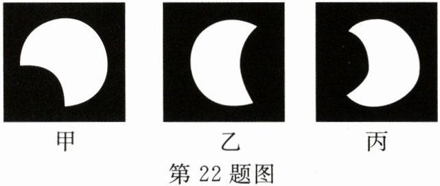 22. 如图所示是某同学拍摄的某次日全食不同时刻的甲、乙、丙三张照片。