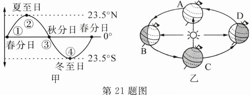 21. 图甲是太阳直射点一年当中回归运动示意图,图乙是地球公转示意图,读图回答下列问题。