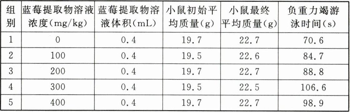 |组别|蓝莓提取物溶液浓度(mg/kg)|蓝莓提取物溶液体积(mL)|小鼠初始平均质量(g)|小鼠最终平均质量(g)|负重力竭游泳时间(s)|