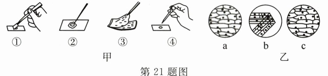21. 图甲为制作洋葱鳞片叶内表皮细胞临时装片的几个步骤,图乙为实验过程中看到的几个视野,请据图回答下列问题。