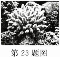 23. 珊瑚虫身体微小,口周围长着许多小触手,可用来捕食海洋中的微小生物。它们能吸收海水中的矿物质来建造外壳,以保护身体。珊瑚虫大多群居生活,虫体虽一代代死去,但它们分泌的外壳却年深日久地堆积在一起,慢慢形成千姿百态的珊瑚。珊瑚虫体内有藻类和它共同生活,并为其提供用于呼吸的氧气,而珊瑚虫的废物则可作为藻类的养料。