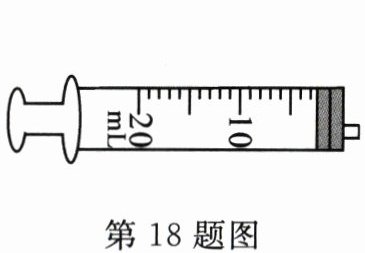18. 小杭发现注射器上有体积单位的标度,如图所示。注射器的规格是20mL,即$______m^3,$量出注射器有刻度部分的长度为10.00cm,则注射器的活塞横截面积为$______cm^2。$