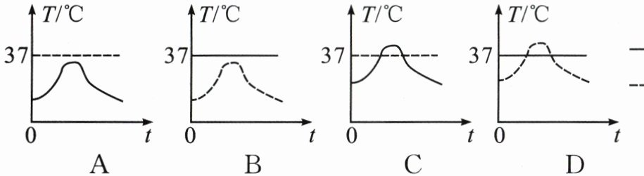 14. 将一支普通温度计和一支示数为$37^{\circ}C$的体温计放在窗台同一位置,记录一天中温度计示数$T随时间t$的变化情况并绘成图像。下列图像可能正确的是…………………………………… ( )