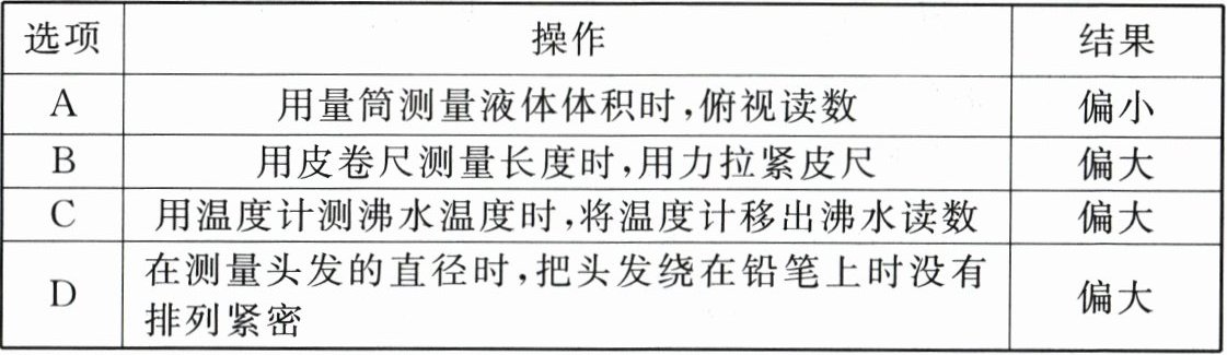 |D|在测量头发的直径时,把头发绕在铅笔上时没有排列紧密|偏大|
