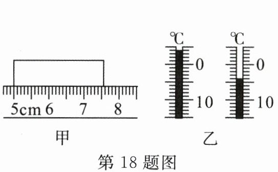 18. 要对有关现象做定量研究,就需要测量。如图甲所示,用刻度尺测量一木块长度,被测木块的长度是______cm。用同一温度计分别测量某天正午与晚上的气温,两次温度计的示数如图乙所示,则两次测量的气温差是______$^{\circ}C$。