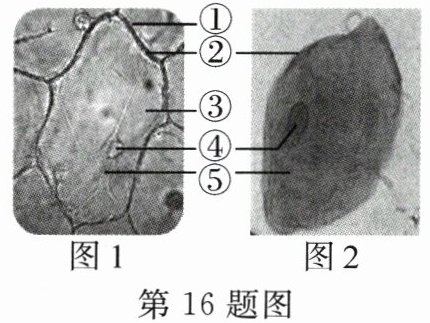 16. 实验课上,小良同学制作了洋葱鳞片叶内表皮细胞和人口腔上皮细胞的临时装片,通过显微镜进行观察,结果如图1和图2所示,请据图回答下列问题(均填序号及名称)。