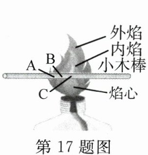 17. 小金点燃酒精灯,观察到火焰分为外焰、内焰和焰心三层。如图所示,将一根小木棒放在火焰中心约3秒后取出可以看到火柴梗的______(填“A”“B”或“C”)处最先变黑。小金看书后知道有些化学物质在常温下反应非常缓慢,用酒精灯加热这些化学物质的目的是______。小金用试管加热液体时,应该注意试管口______(填“与桌面成$45^{\circ}$角”“略向下倾斜”或“竖直朝上”)。