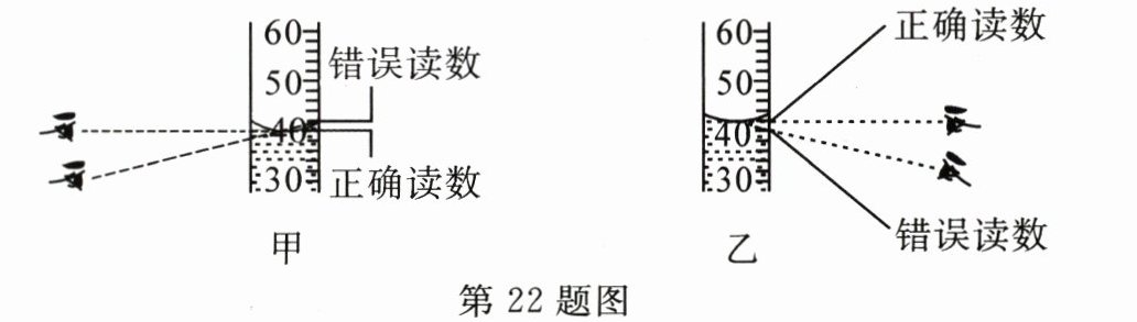 22. 甲、乙两位同学在争论量筒的使用问题,甲同学说:使用量筒时如果没有平视,仰视使读取的数据比正确读数大;乙同学说:不对,仰视使读取的数据比正确读数小。为了说服对方,两人分别画了一个示意图,请你判断,甲、乙两位同学谁的分析是对的?______,理由是______。