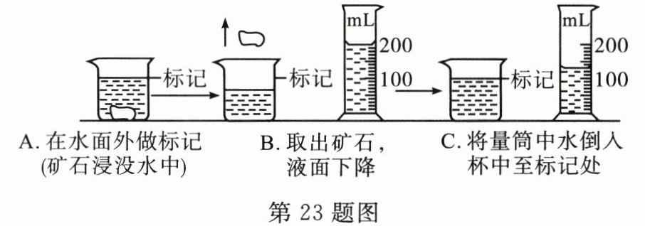 23. 小乐同学用量筒、烧杯等器材测量矿石的体积,如图所示。