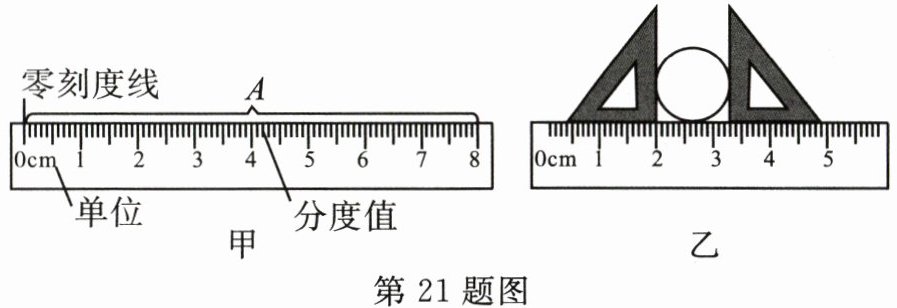 21. 学习了“长度测量”后,小科准备借助刻度尺和三角板测量一枚纽扣的直径。请回答下列问题。