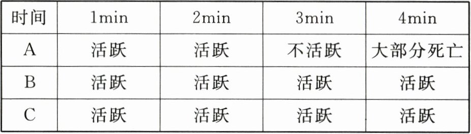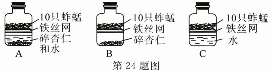 24. 某科学兴趣小组为研究杏仁对昆虫的毒害作用,做了如下实验:取三个相同的透明玻璃瓶标为 A、B、C;在 A 中加入少量的水和一定量的碎杏仁,在 B 中加入与 A 等量的碎杏仁,在 C 中加入与 A 等量的水;塞好瓶塞静置 2h。然后打开瓶塞,在各容器铁丝网上分别放 10 只蚱蜢,再塞好瓶塞(如图),观察并记录蚱蜢的状态,如表所示。