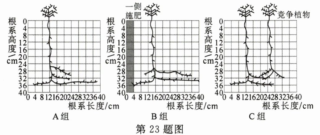 23. 生长在西北沙漠地区的骆驼刺根系发达,能感知周围土壤环境,并做出相应反应。为研究影响骆驼刺根系生长的因素,研究人员进行相关实验,结果如图所示。请分析回答下列问题。