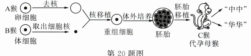 20. 2017 年,中国科学家成功克隆了两只猕猴:"中中"和"华华",它们是世界首例利用体细胞克隆技术诞生的灵长类动物。这两只珍贵猕猴诞生的过程如图所示。请分析回答下列问题。