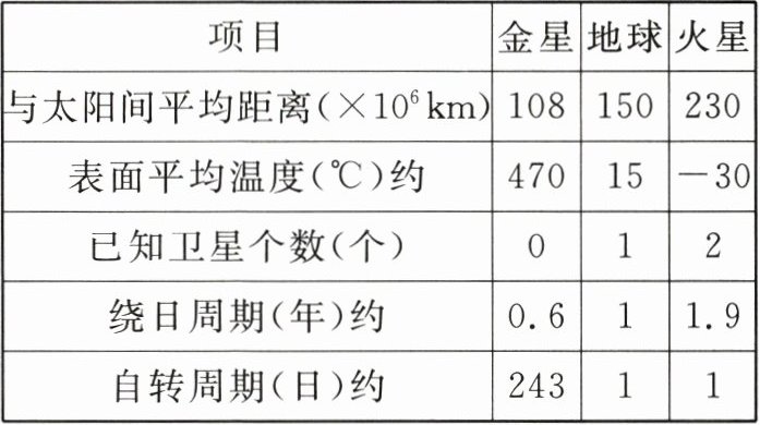 |与太阳间平均距离($× 10^{6}km$)|108|150|230|