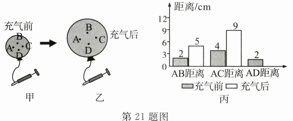21. 小明在学习现代宇宙理论后,采用一个气球来模拟星系运动的特点:用打气筒充气将气球从图甲变为图乙。分别测出气球上点 B、C、D 到 A 的直线距离变化,部分结果如图丙。