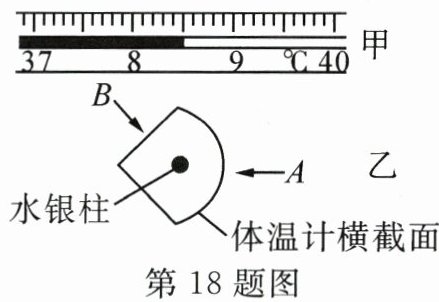 (2)如图所示,甲是常用体温计的刻度部分,横截面如图乙所示,其正面呈圆弧形。进行读数时,沿方向______(填“A”或“B”)观察易于读数,这是应用了放大镜原理。此体温计的示数是______$^{\circ}C$。