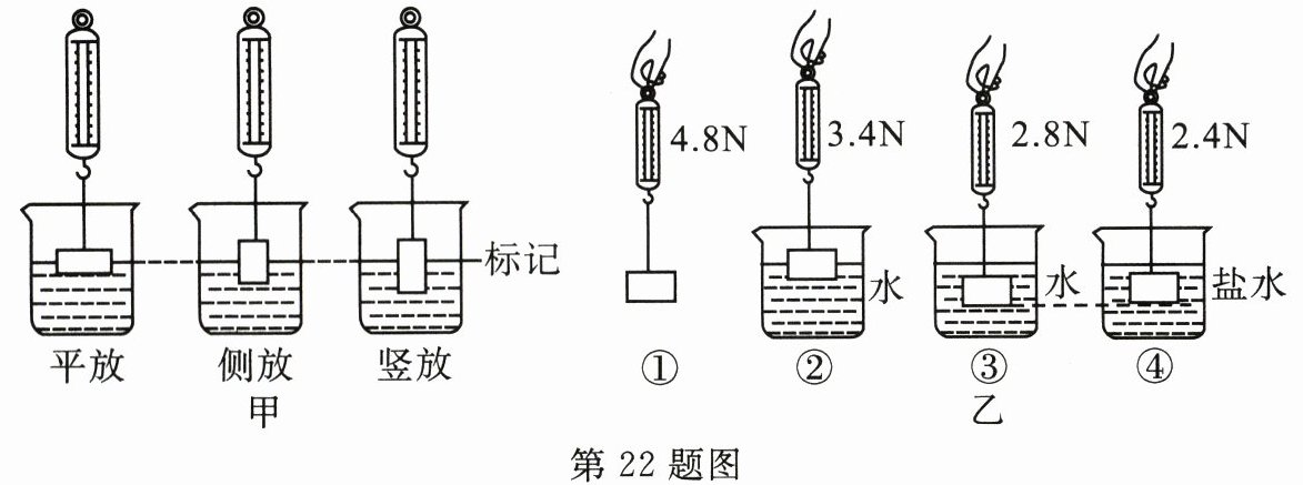 (1)小科先后将该一长方体金属块平放、侧放和竖放放在弹簧测力计上,使其部分浸入同一杯水中,保证每次水面到达同一标记处,如图甲所示。小科研究的自变量是______。