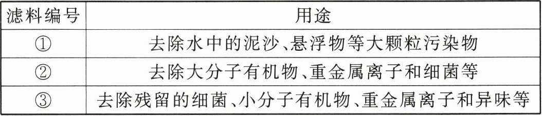 (1)小金选择了三种滤料去除原水中的杂质,三种滤料的用途如表所示,则滤料甲、乙、丙分别为______(按序填编号)。