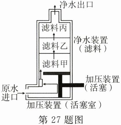 27.(6分)为了解决人们在野外生活和工作时的饮水问题,小金开展了便携式野外净水器的设计和制作。设计方案如图所示,其中箭头表示预设的水流方向。