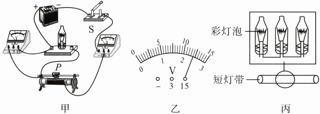 (1)【参数测定】小组成员购买了一款彩灯泡,其正常工作时的电流为 0.25A;为测定该彩灯泡正常工作所需电压,小组成员按图甲电路进行实验:闭合开关,调节滑动变阻器滑片,当电流表示数为 0.25A 时,电压表示数如图乙所示。滑动变阻器在这个实验中的作用是_______。