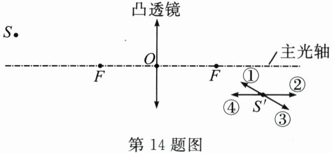 14.如图,凸透镜的焦点为F,O是光心。S是放在凸透镜前的点光源,S'是S经凸透镜所成的像,当S沿平行主光轴的方向向右移动,但物距始终大于焦距f时,则像S'沿箭头 ……………( )