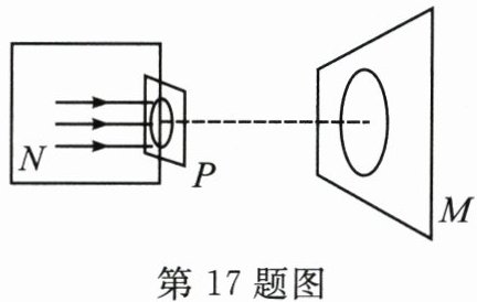 17.如图所示,盒子中N处有水平向右的平行光,P为盒右侧面上的一个圆孔,M是竖直光屏。小明在厚平板玻璃、凸透镜、凹透镜中取一个恰好嵌入圆孔P,发现在左右移动光屏M的过程中,始终在光屏上呈现一个比圆孔P大的圆形光斑。则嵌入圆孔P的那个光学器件是______,该光学器件对光有______作用。