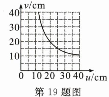 19.如图所示是探究凸透镜成像规律时,记录并绘制的物距u与像距v的关系图像,则该凸透镜的焦距是______cm。当$u= 15cm$时,光屏上成倒立、______(填“放大”“缩小”或“等大”)的实像,______(填“照相机”“投影仪”或“放大镜”)就是根据这一原理制成的。