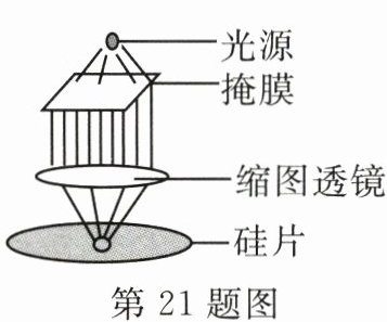 21. 生产芯片时有一道工艺要用到光刻机,其工作原理如图所示,缩图透镜(凸透镜)把掩膜上的电路图按比例缩小 4~10 倍,再被激光映射到硅片(相当于光屏)上,成倒立、缩小的实像。