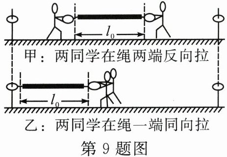 9.小明和小思想把一条弹性绳拉开,使弹性绳两端的拉环能分别套在相隔一段距离的两根柱子上,用来晒衣服。现有两种办法:一种是按图甲的方法做;另一种是按图乙的方法做。关于这两种做法下列说法正确的是…………………………………………………………( )