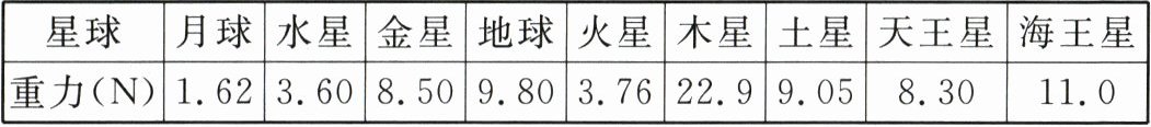 18.下表列出的是质量为1kg的物体在不同星球上受到的重力,请回答下列问题。