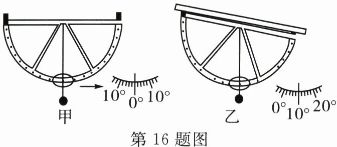16.现有一坡度仪,由半圆形的刻度盘及与细线相连的重锤组成,如图甲所示,当刻度盘上沿水平放置时,刻度读数为"0°"。若将该坡度仪挂在一倾斜直杆上时,刻度读数如图乙所示,则该直杆的坡度为______,此装置的原理是利用重力______的特点。