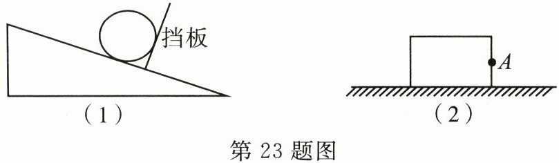 23.(1)如图所示,斜面上的小球被挡板挡住,请作出小球受到的重力 G 和小球对挡板的压力 F 的示意图。