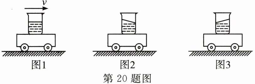 20. 如图 1 所示,盛有水的烧杯随小车一起水平向右做______(填“加速”“减速”或“匀速”)运动。若此时小车突然刹车减速,烧杯中的水面应是图______的形状。
