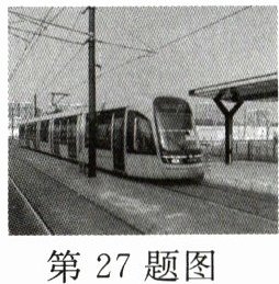 27. (7 分)某地的有轨电车即将投入运行。首列有轨电车“××号”的总长度为 34.8m,运营时最高速度为 70km/h,其质量为 50t。
