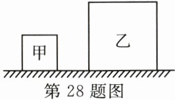 28.(8 分)如图所示,甲、乙两个均匀正方体放在水平地面上,已知甲的密度为$1000kg/m^{3}$,边长是 0.1m。沿水平或竖直方向将甲、乙各切去一半的体积,并将切去的部分叠放在对方剩余部分的上方,甲、乙对地面压强变化如表所示。(g 取 10N/kg)