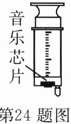 24.如图所示,为了探究声音能否在真空中传播,小淇等同学将一块正在发声的小音乐芯片放在注射器中,再将活塞推到底端,并用橡胶帽封闭注射口,然后用力往外拉活塞,分辨听到的音乐声的变化。