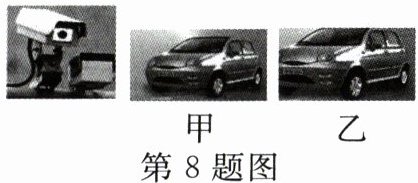 8. 如图是十字路口处安装的监控摄像头,甲、乙是一辆汽车经过十字路口时,先后拍下的两张照片,下列说法正确的是……………( )