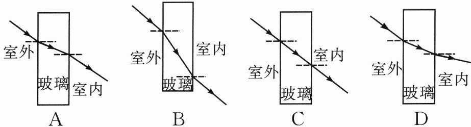 10. 如图,能正确表示光从室外通过窗户玻璃进入室内的光路图是…