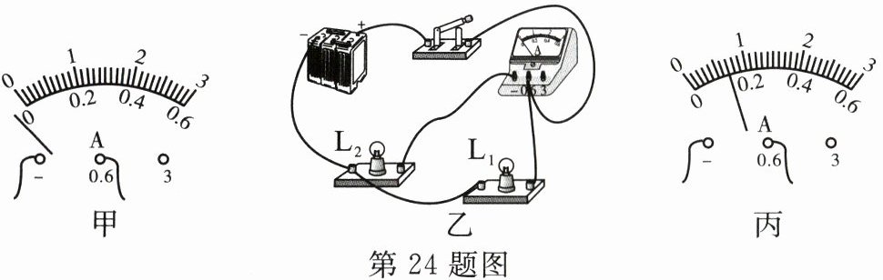 (2)小明同学连接的电路如图乙所示,则电流表测的是通过______(填$“L_1”“L_2”$或“干路”)的电流;闭合开关后,电流表的示数如图丙所示为______mA。