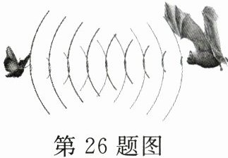 26.(6分)蝙蝠在捕食昆虫时发出一种每2min振动$1.08×10^7$次的声音,声音碰到昆虫后会反射回来,蝙蝠听到回声后可以确定昆虫的方位(如图所示)。