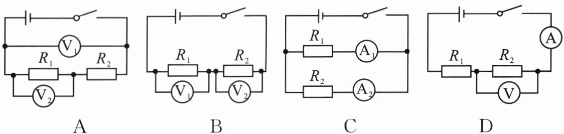 10. 为了比较电阻 $ R_{1} $ 和 $ R_{2} $ 的大小,四位同学分别设计了如图所示的电路,其中不可行的是……………………………………………… ( )
